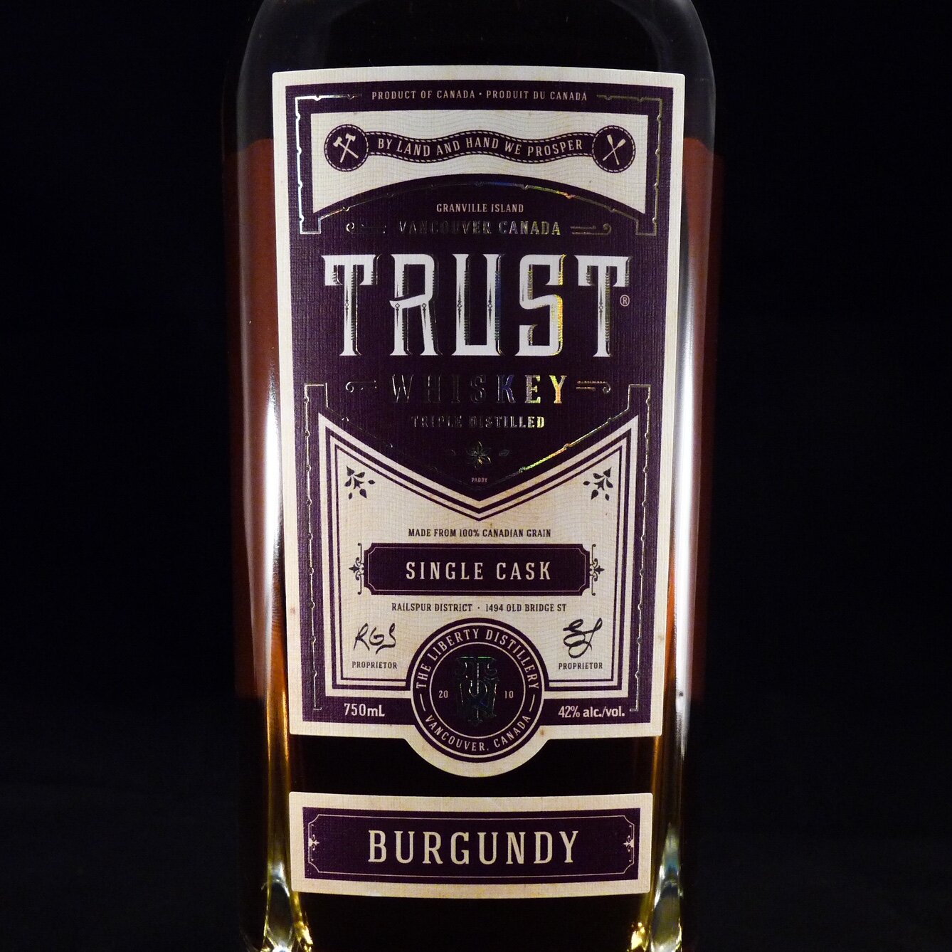 TRUST Whiskey begins with 100% organic hull-less unmalted barley grown in Armstrong, British Columbia. It is triple-distilled in our handmade CARL single copper pot still. For just shy of four years, it has been quietly resting in mature 220-litre French white Burgundy barrels to slowly gain character, complexity and colour.